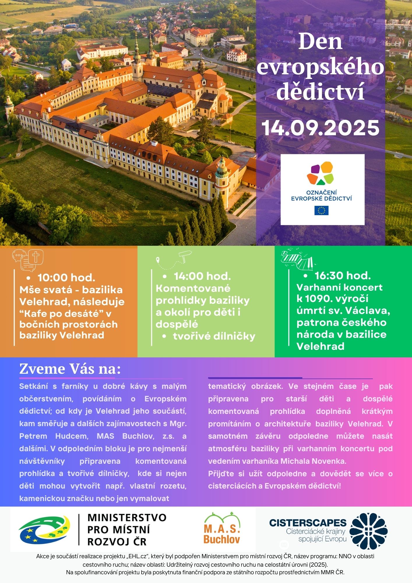 V odpoledním bloku je pro nejmenší návštěvníky připravena komentovaná prohlídka a tvořivé dílničky, kde si nejen děti mohou vytvořit např. vlastní rozetu, kamenickou značku nebo jen vymalovat tematický obrázek. Ve stejném čase je připravena komentovaná prohlídka pro starší děti a dospělé s krátkým promítáním o architektuře baziliky Velehrad. V samotném závěru odpoledne můžete nasát atmosféru baziliky při varhanním koncertu pod vedením varhaníka Michala Novenka. Přijďte si užít odpoledne a dovědět se více o cisterciácích a Evropském dědictví!