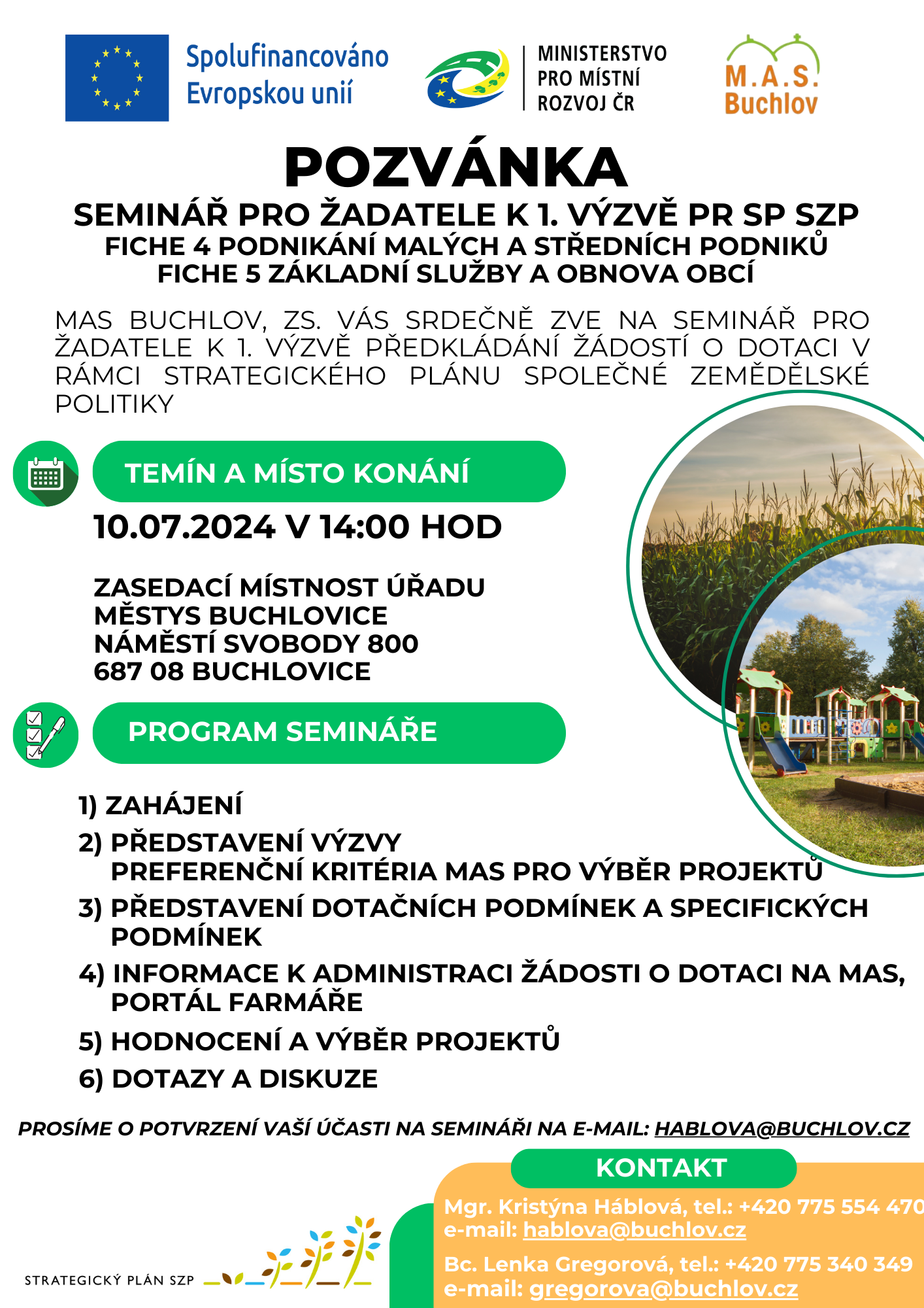Seminář pro žadatele se bude konat 10.07.2024 ve 14:00 v zasedací místnosti Městys Buchlovice (náměstí Svobody 800, 687 08 Buchlovice). Program semináře je uveden v pozvánce.